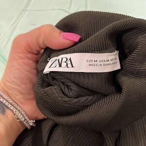 This is a Zara olive green turtle neck. Size is medium. I had never been worn but has no tags. The shirt does have a small rip on the neck part as seen in pictures and video and also has two small spots. I never try cleaning it. But I am sure you can get it off and get the neck part fix. The price reflex’s on the condition.