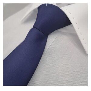 This navy blue tie, packaged in an elegant black gift box, offers a sleek design suitable for professional settings.