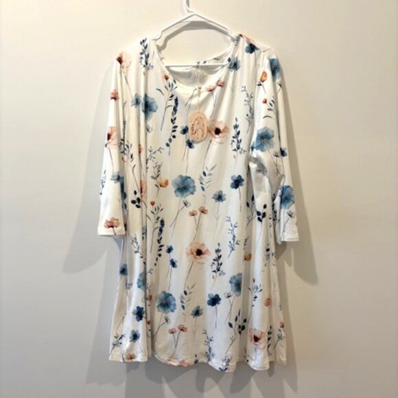 This pretty tunic has a relaxed fit that flares out towards the hem. It has a round neckline and 3/4 sleeves. This tunic measures 33 inches in length from the shoulder to the hem and measures 27 inches in width from the underarm to the other underarm. This top is brand new!