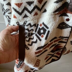 Stylish fleece jacket with geometric patterns. Features brown, orange, and cream colors. Perfect for cozy wear. Casual. Fall. Winter. Outdoors. Camping. Hiking. Tribal. Aztec.
