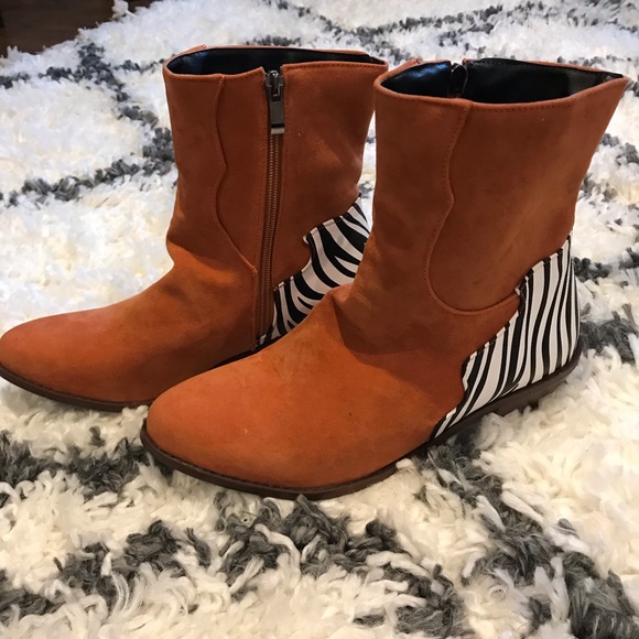 Another faux find. Cross between brown and red, these are faux suede! Please see all photos and feel free to inquire. Price reflects. Never been worn.