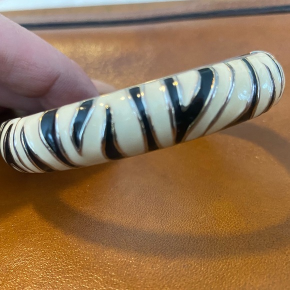 Cool zebra patterned cuff. Easy on/off hinge opening. Costume jewelry. Good condition.