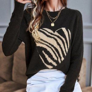 Zebra Heart Print Raglan Sleeve Knit Sweater Top