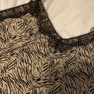 This top can be worn out to dress up and it can also be worn as an intimate one. It’s zebra print with a lace hem on the top.