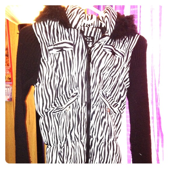 2 pockets , zebra stripes, warm, used twice! Has a hoddie, long sleeve!