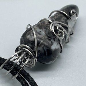 This genuine Zebra Jasper tumbled stone is hand wrapped (by yours truly) in silver plated copper wire. This creation is 2" long (the pendant is 1.5" long), 10oz in weight, and comes with an adjustable sliding-knot necklace of 1.5mm black nylon cord that can be easily adjusted between 10-20" in length.
