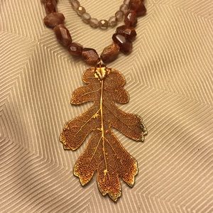 Designer, custom piece - unique and exclusive. Constructed of Czech glass, copper coated leaf and sun stone with copper toggle closure. Absolutely stunning and special.
