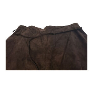Item: Womens suede leather skirt with long fringe and pointed hem, has a thin tie belt that is attached at the back so it does not get lost.