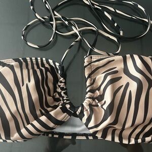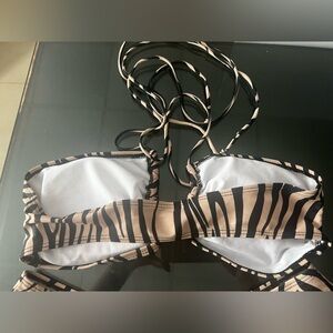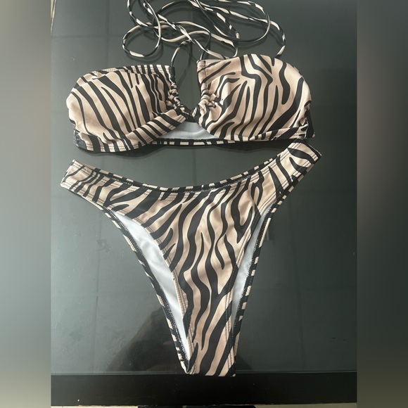 Stylish zebra print bikini set. Features a bold black and tan pattern.