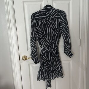 Stylish zebra print dress in classic black and white. Brand new, never worn. Missing one button as shown, but cannot be seen when the rest of the buttons are closed. Tie waist closure. Long sleeves. Sheer material with lining. Never worn. Excellent condition. Smoke free home.