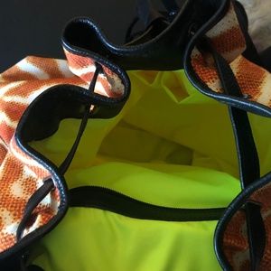 * 100% Polyester, Bovine leather Details: maxi, canvas, multicolor pattern, drawstring closure, logo detail, leather applications, internal pockets, buckle.