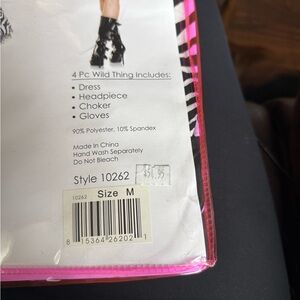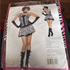 Stylish zebra print costume with matching gloves. Includes dress, headpiece, choker, and gloves.