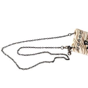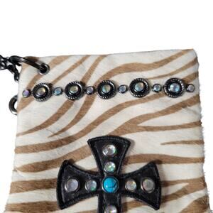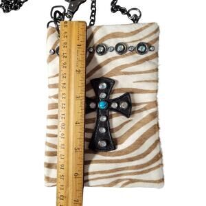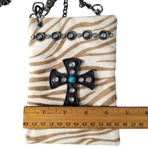 Unique zebra print crossbody bag with a striking rhinestone cross design. Features a chain strap and secure magnetic snap closure. Compact and stylish for carrying essentials.
