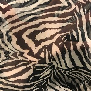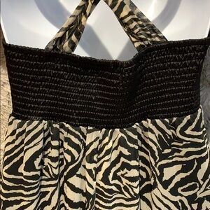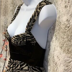 Show your wild side with this zebra print dress by Guess! 100% polyester with a sheer Chiffon like feel of the outter layer; flowy and light with an inner black layer. Criss cross straps in back with stretch/elastic to upper back to allow for a snug fit with give (shown in 2nd to last pic) Silky feel to the bust with a small amount of support/lining of inner bust. No stains. EUC Two threads on back (see pic) Worn only a couple of times. Perfect spring and summer dress! Approximately knee length.