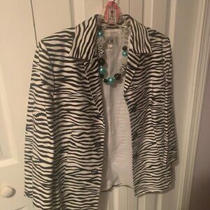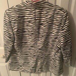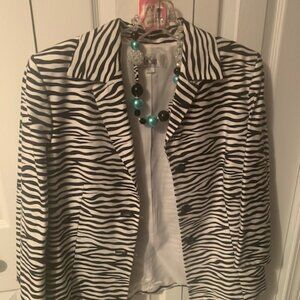 Women's black and white zebra print jacket, cotton lined, built in shoulder pads, very well made! Collar, 3 front buttons, sharp and outstanding! In excellent condition, never worn! Size 12