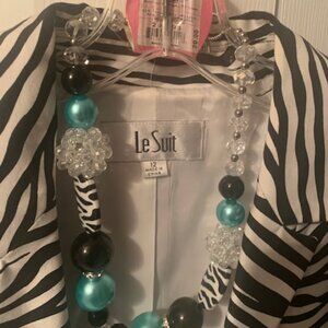 The necklace is NWT, glass beads, zebra, black and light teal colors, chunky, and toggle clasp.