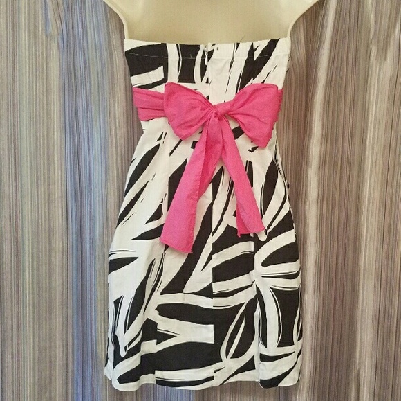 Zebra print, hot pink waist bow that ties from the back, back zipper closure, light padding in bust, thigh length, side pockets, cotton material.