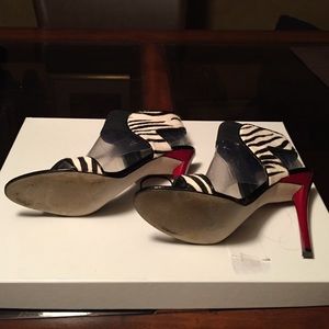 Ankle High Zebra Print Pony Hair Sandals. Black Patent Leather Trim and Red Heel