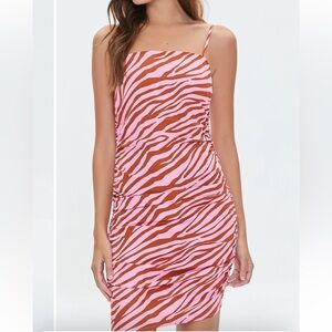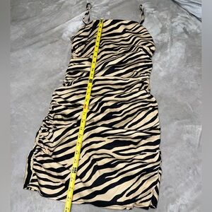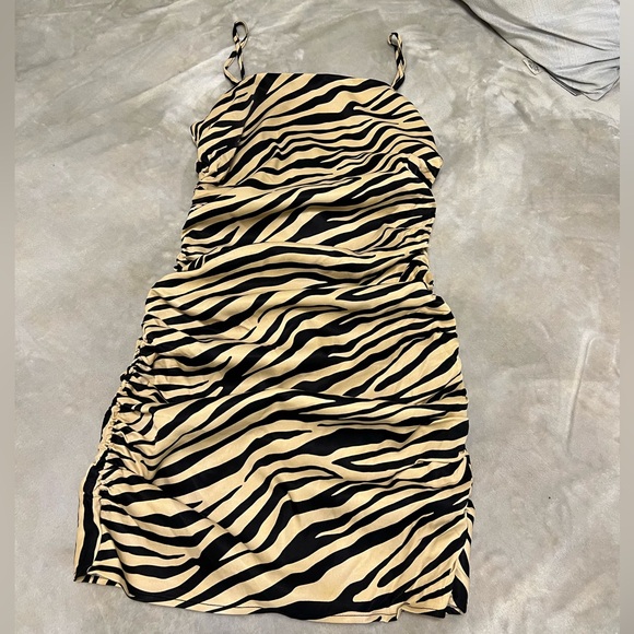 Stand out in this chic zebra print ruched dress. Perfect for any occasion. I’ve never gotten to wear it unfortunately! The material is very thick and feels nice so nice and silky!