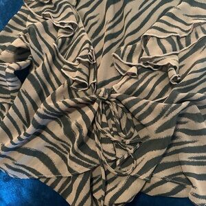 Elevate your style with this chic zebra print top. Featuring elegant ruffles and a tie-front design, it's perfect for any occasion.