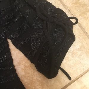 The most comfortable sweater!! Black with silver accents, has ties on the sleeves for another accent, sleeves are around elbow length. Pair this with jeans, palazzo pants or even lounge in it with a latte for fall.