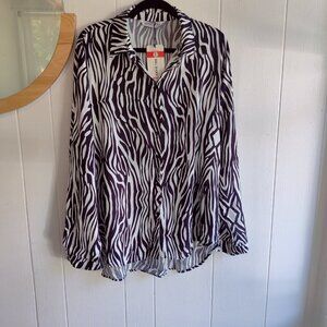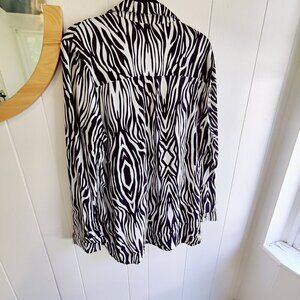 Beautiful Zebra Striped blouse, back dart, black buttons at front and on cuffs. Long length 32.5" and armpit across at 26". Size 20