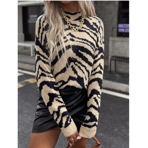 Zebra Printed Knit Sweater Tan Black Animal Print Drop Shoulder