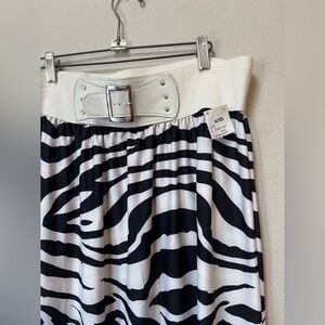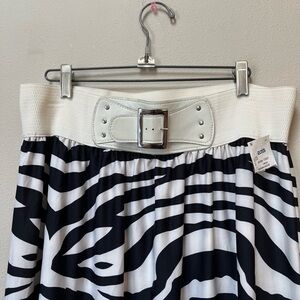 New with tags colorful zebra-stripe midi skirt with a wide stretch waistband and flattering pull-on fit. Bold black-and-white animal print paired with bright multicolor stripes at the hem for a fun statement look.