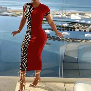 Zebra Striped Patchwork Bodycon Dress (Color: Red)