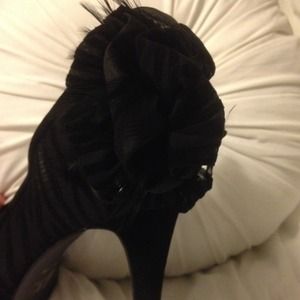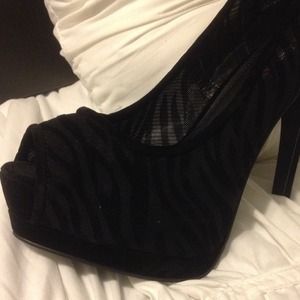 JustFab peep toe heels "Nikole" style in black. Zebra pattern with feather detailing in back. Pictures do not do the detailing justice. Heel is satin lined. 5 1/2" heel 1 and 1/2" platform.