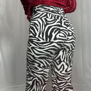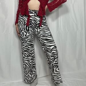 Stand out in these bold zebra print flared pants! Super flattering high-waisted fit with a soft stretch fabric that hugs you in all the right places. Eye-catching black and white pattern gives major Y2K and indie sleaze vibes. Perfect for a night out, festival look, or spicing up your everyday wardrobe. Great condition — a total statement piece.