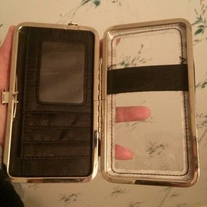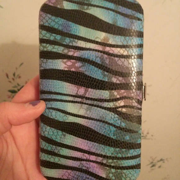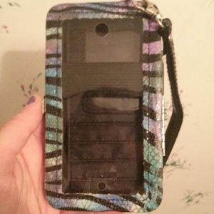 Very cool Zebra wallet that you keep your phone in as well. It will fit a thin phone (iPhone) or any size aroumd the same as the iPhone works best. There are slots for cards and a strap for your wrist, also has plastic screen cover to keep phone protected. Great for a night out or for running errands.
