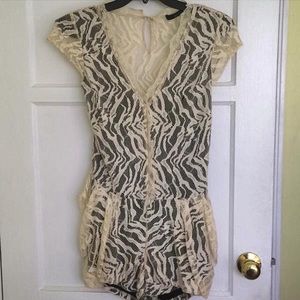 Contrast zebra printed romper with a back loop button clasp, lace detailing along the v-neck center and slighty plush shoulder pads. Super cute for date night or a day out with your girls.