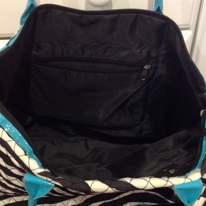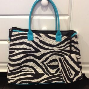 Large zebra print tote bag. Perfect for traveling or for a day at the beach. Has two zipper pockets inside and an attached small pouch. Great for phone, keys and money. Has small tear on bottom other then that it's in great condition. Purchased from Tillys