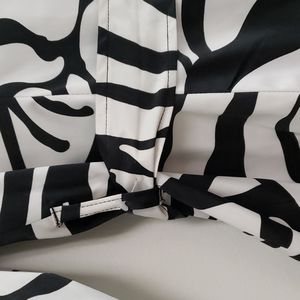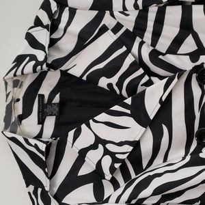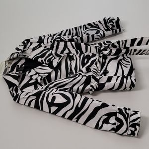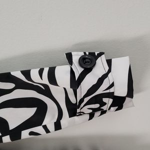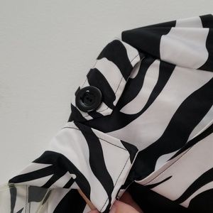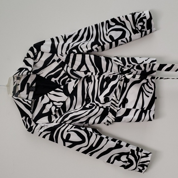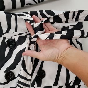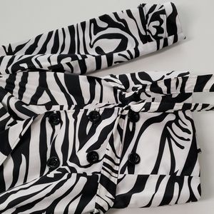 Cool, satin-feel, zebra print short trench coat. Double-breasted with large black button details at the cuffs and shoulder. Tie-waist belt. Get the trend for less!🦓