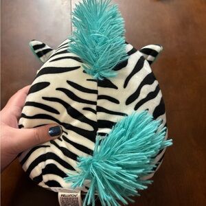 Adorable zebra plush toy squish mallow with black and white stripes. Features teal accents on ears and mane.