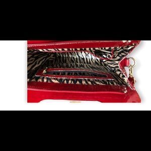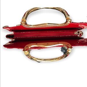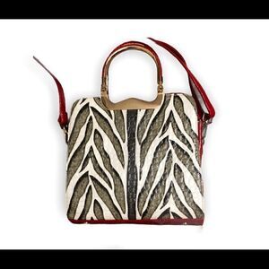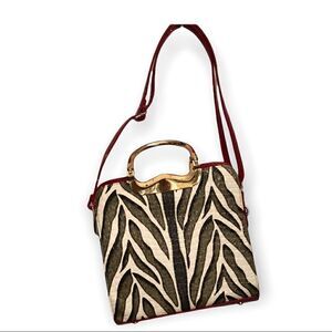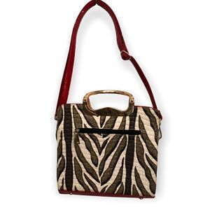 Zebra style print with red and gold accents shoulder tote purse. Patent leather look. Boutique item. Removable strap, round braided red handles. Few nicks in handle and inside of red area.