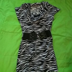 Zebra print tunic with attached accent belt cowl neckline with peek-a-boo lace detail