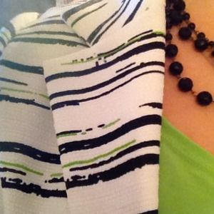 BRAND NEW WITH TAGS. Quarter-length sleeves with line green, black, and white horizontal strips. Can be ties together at front.