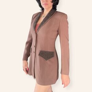 this darted, brown blazer in a size 6, featuring elegant beaded and embroidery on the lapel and faux front pocket flaps.