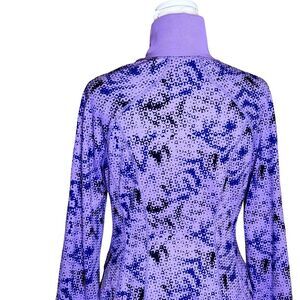 Mock neck, purple/black/blue geometric print.