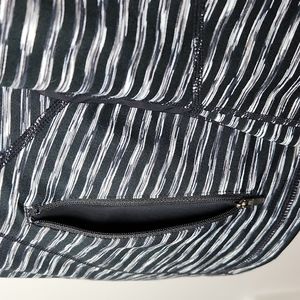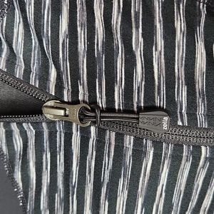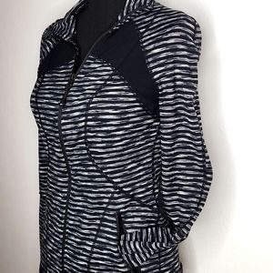 Zella athletic workout jacket, Black Gray and white digital stripes. Mesh panels on chest and underside of arms. Thumb hole at wrist. Double zipper allowing zipping from top or bottom. 2 side zip pockets with special compartment for a key. Inside hidden pockets. An excellent prelupt condition with normal signs of wear. See pictures for additional details and measurements