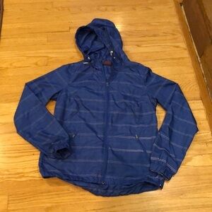 Excellent, like new condition. The perfect jacket for pre-and post workouts. Features adjustable drawcord to break the wind against your head and neck and reflective details to keep you seen in low light or at night. The high/low hem provides added coverage where you want it. Front zip. Adjustable hood. Front secure zip pockets. 100% Polyester. Machine washable. Smoke free home.
