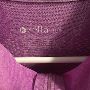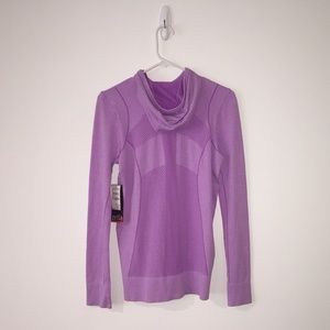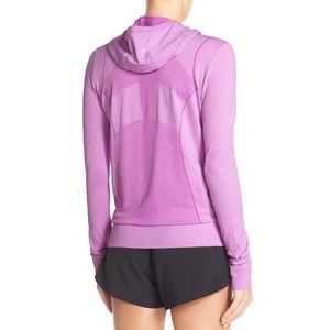 Zella Dharma Hooded Athletic Zip Up Jacket has original Nordstrom and designer/brand tags attached (never worn) and is described as Purple Daylight in color. This slim-fit activewear top has long sleeves, front zip closure, pattern detail, and front split kangaroo pocket. Size: Small. 71% Nylon/29% Polyester. Zeltek Seamless.
