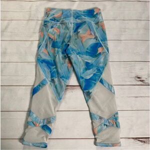 VGUC. Zella Girls Print Crossover Crop Leggings. Blue and peach feathers. GUC. A couple tiny marks on the leggings. Please see all pics. Size 10/12