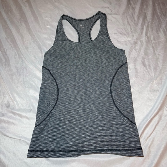 Stylish gray racerback tank top. Perfect for workouts or casual wear. Comfortable and chic design.