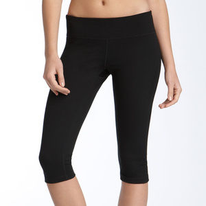 Lean capri leggings, ideal for working out or wearing out, are cut from a stretchy moisture-wicking knit and are sewn with flatlock seaming for a comfortable, chafe-free fit.
