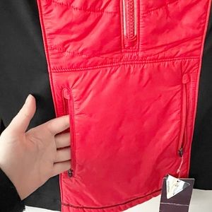 Color is bright red with black sides and sleeves. Puffy core with stretch side panels and sleeves. Pullover style with half zip front. Long sleeves with thumb holes. Kangaroo pouch with zipper closures on each side. Form fitting style. Lightweight. Unlined.