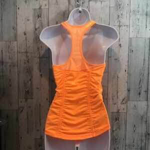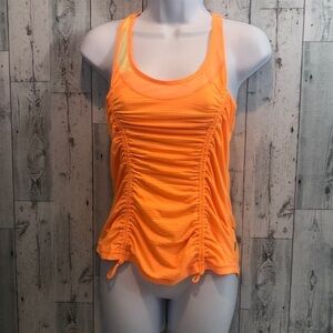 Orange, has discoloration on one side of the mesh at neck, ruching in front can be made shorter,colors may vary due to lighting,used condition, size: S