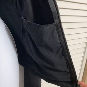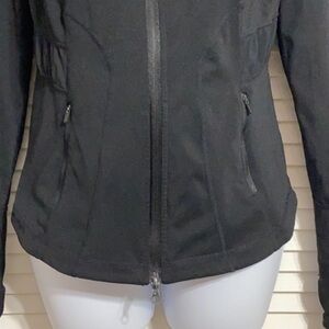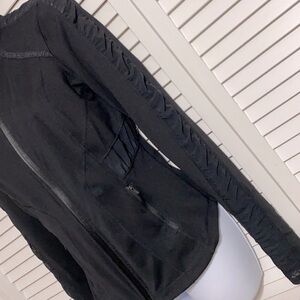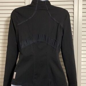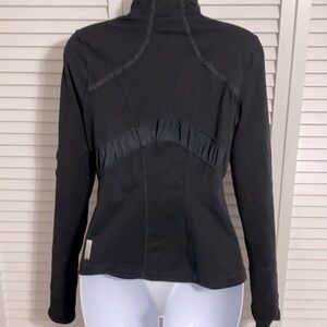 Black Zella workout jacket. Ruched design for a flattering fit. Sheer panels on back shoulder. Two way zip, can zip up or down. Thumb holes on ends of sleeves. Zippered pockets. Mock neck (no hood). Excellent preowned condition.